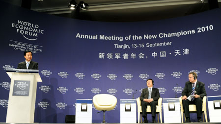 9月15日,在天津梅江會展中心,大連市委書記夏德仁(左一)在閉幕全會上講話。當日,世界經(jīng)濟論壇2010年新領軍者年會(第四屆達沃斯論壇)舉行閉幕全會。
