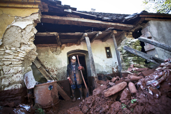 一位年老的村民正在災(zāi)后清理被泄漏廢水沖刷后的房屋和花園。法新社發(fā) |