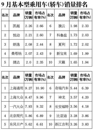 9月,從前十名轎車品牌銷量排名情況來(lái)看,與上月比較,朗逸、桑塔納排名保持不變。排名上升的有:凱越、悅動(dòng)、旗云;排名下降的有:捷達(dá)、新寶來(lái)。F3、QQ、卡羅拉跌出前十,科魯茲、夏利、天籟新進(jìn)前十。