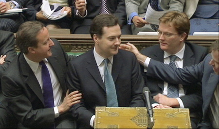 圖為英國財(cái)政大臣喬治·奧斯本(左二)20日在議會公布政府削減財(cái)政預(yù)算方案之后的情形,左一為英國首相戴維·卡梅倫。根據(jù)該方案,英國政府將在未來幾年削減830億英鎊的財(cái)政預(yù)算,其中社會福利開支將減少70億英鎊,英國人的退休年齡到2020年也將升至66歲。英國官方數(shù)據(jù)顯示,政府上一財(cái)年的財(cái)政赤字為1454億英鎊,創(chuàng)二戰(zhàn)以來的最高紀(jì)錄。