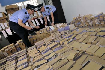 假發(fā)票在全國屢禁不止。圖為今年8月,鄭州警方成功打掉一個涉嫌制售假發(fā)票的犯罪團(tuán)伙,搗毀假發(fā)票制售存儲窩點(diǎn)7個,收繳假發(fā)票32萬余份(包括3萬多份增值稅假發(fā)票),假發(fā)票可開具的票面金額高達(dá)150多億元。新華社發(fā)(劉書亭/攝) |