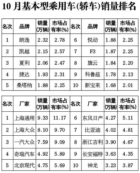 10月銷量排名前十位的轎車品牌與上月相比,朗逸、夏利、F3和科魯茲呈不同程度增長,其它品牌有所下降。上述十個品牌共銷售19.39萬輛,占轎車銷售總量的23.22%。