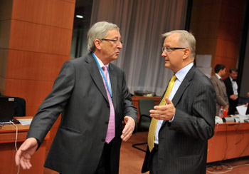 11月16日,歐元集團主席、盧森堡首相容克(左)在比利時首都布魯塞爾舉行的歐元區(qū)財長會議上與歐盟委員會負責經(jīng)濟與貨幣事務(wù)的委員雷恩交談。當天,歐元區(qū)財長會議在布魯塞爾舉行。由于近來愛爾蘭、葡萄牙等歐洲國家的債務(wù)形勢緊張,外界普遍擔心歐洲國家會陷入第二輪主權(quán)債務(wù)危機。新華社記者