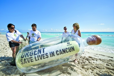 坎昆聯(lián)合國氣候變化大會29日將在墨西哥海濱城市坎昆召開,來自190多個國家和地區(qū)的官員、學(xué)者及非政府組織成員將就氣候變化問題展開磋商。分析認為,雖然各方普遍認為坎昆會議難以達成具有法律約束力的協(xié)議,但此次會議在資金技術(shù)、森林保護等方面仍有達成共識的空間,可為明年南非氣候大會打下基礎(chǔ)。圖為環(huán)保人士在坎昆海灘開展活動。(相關(guān)報道見四版)