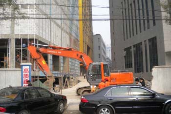 在合肥市重點工程——金鷹國際購物中心項目工地,一臺挖掘機(jī)停放在工地入口處。據(jù)一名工人介紹,11月2日晚,該工地突然出現(xiàn)了多名不明身份人員,隨后3輛大型挖掘機(jī)停放在工地,封堵了該工地出入口及施工現(xiàn)場,造成該工地正常施工中斷。截至12月2日,仍有一臺挖掘機(jī)停放在工地現(xiàn)場。