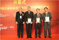 在11月23-24日舉行的“2010年中國光通信發(fā)展與競(jìng)爭(zhēng)力論壇(ODC’2010)”上,亨通光電股份有限公司喜獲“2010年中國光通信最具綜合競(jìng)爭(zhēng)力企業(yè)十強(qiáng)”、“2010年中國光纖光纜競(jìng)爭(zhēng)力十強(qiáng)”、“2010年光通信最佳客戶服務(wù)獎(jiǎng)項(xiàng)”。公司總經(jīng)理錢建林先生與烽火科技集團(tuán)副總裁呂衛(wèi)平先生、長飛光纖光纜有限公司董事長文會(huì)國先生、康寧通信(大中華區(qū))總裁安杰先生一同獲得“2010年中國光通信年度管理人物獎(jiǎng)”。