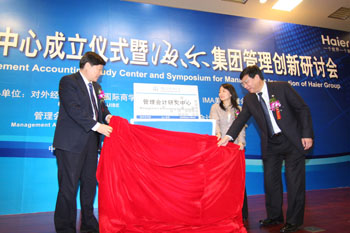 圖為海爾集團首席執(zhí)行官張瑞敏與美國管理會計師協(xié)會中國區(qū)總代表李蔚、對外經(jīng)貿(mào)大學(xué)校長施建軍一起為“管理會計研究中心”揭牌。資料圖片 |