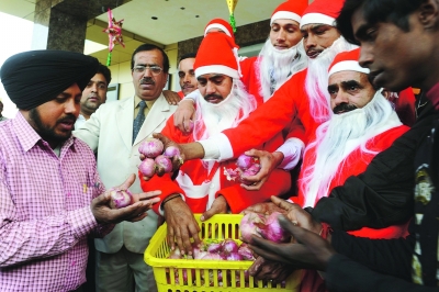 2010年12月23日,在印度阿姆利則的街道上裝扮成圣誕老人的印度人向路人發(fā)放免費(fèi)的洋蔥。近日印度主食洋蔥價(jià)格暴漲,加劇了通脹風(fēng)險(xiǎn),引發(fā)民眾不滿。印度政府22日決定降低進(jìn)口蔬菜的關(guān)稅,以控制印度主食價(jià)格。