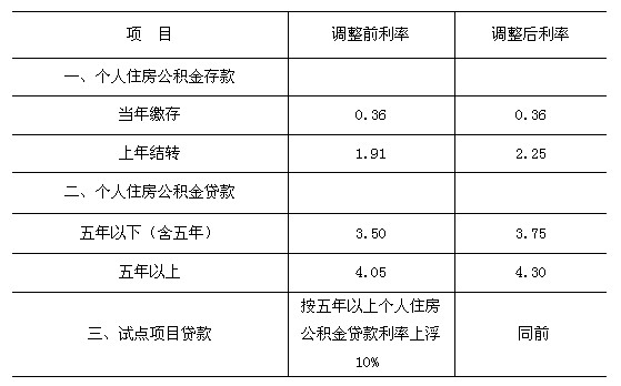 一、從2010年12月26日起,上年結(jié)轉(zhuǎn)的個人住房公積金存款利率上調(diào)0.34個百分點,由現(xiàn)行的1.91%調(diào)整為2.25%。當年歸集的個人住房公積金存款利率保持不變。 二、從2010年12月26日起,上調(diào)個人住房公積金貸款利率。五年期以下(含五年)及五年期以上個人住房公積金貸款利率均上調(diào)0.25個百分點。五年期以下(含五年)從3.50%調(diào)整為3.75%,五年期以上從4.05%調(diào)整為4.30%。 三、從2010年12月26日起,開展住房公積金支持保障性住房建設(shè)項目貸款試點的城市,貸款利率按照五年期以上個人住房公積金貸款利率上浮10%執(zhí)行,并隨個人住房公積金貸款利率變動做相應調(diào)整。 請各省、自治區(qū)住房和城鄉(xiāng)建設(shè)廳立即將本通知轉(zhuǎn)發(fā)各住房公積金管理委員會、住房公積金管理中心執(zhí)行。對利率調(diào)整后各方面的反映及出現(xiàn)的新情況、新問題要及時處理并上報我部。