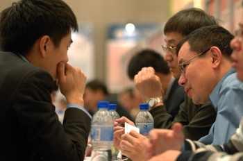 一名留學(xué)德國(guó)的創(chuàng)業(yè)項(xiàng)目負(fù)責(zé)人(右)在洽談會(huì)現(xiàn)場(chǎng)向國(guó)內(nèi)一家企業(yè)代表推介帶來(lái)的芯片開(kāi)發(fā)技術(shù)項(xiàng)目!⌒氯A社記者 黃宗治