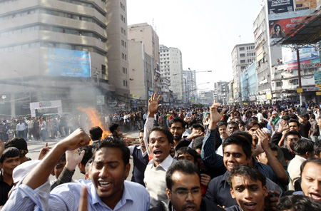 孟加拉國達(dá)卡股票交易所主要指數(shù)10日暴跌9%以上,單日跌幅創(chuàng)下該國股市創(chuàng)立55年來新高,監(jiān)管機構(gòu)被迫停止股票交易,關(guān)閉兩大股票交易所。關(guān)閉股市的消息傳出后,憤怒的投資者聚集到達(dá)卡股票交易所門前舉行了抗議活動,他們?nèi)计鸹鸲、封鎖交易所附近的道路,并呼喊口號,指責(zé)股票交易商和經(jīng)紀(jì)人操縱股價的欺詐行為。對于股市的連續(xù)下跌,該國證券交易委員會官員表示,目前尚不清楚原因。據(jù)悉,孟加拉國政府向達(dá)卡股票交易所附近加派了警力和快速反應(yīng)部隊。