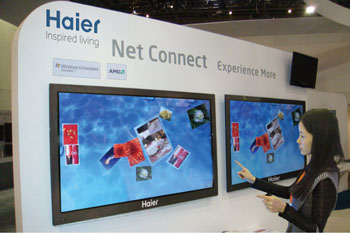 海爾在CES上展出的智能電視能夠?qū)崿F(xiàn)全方位多點(diǎn)控制,支持多人同時(shí)進(jìn)行圖片的放大、縮小、旋轉(zhuǎn)等操作。新華社記者 任海軍