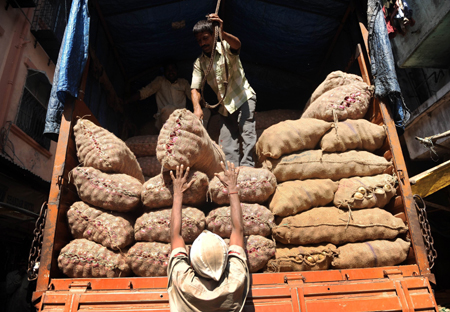 印度政府27日公布該國(guó)最新的食品價(jià)格指數(shù),從今年年初至1月15日以來(lái)該指數(shù)上漲了15.57%,意味著正在經(jīng)歷“洋蔥危機(jī)”的印度仍在承受巨大的通脹壓力。圖為印度一家菜市場(chǎng)外的工人正在卸貨。