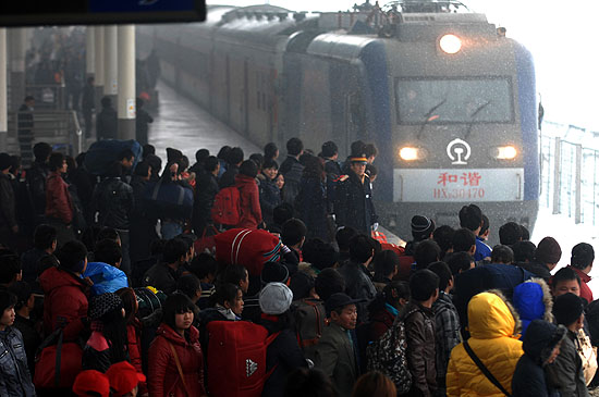 | 2011年1月19日,杭州火車站南站,旅客在站臺(tái)等待列車進(jìn)站。記者 黃宗治/攝 |