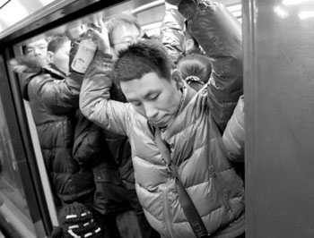 “人進(jìn)去,相片出來;餅干進(jìn)去,面粉出來……”這些形容北京地鐵擁擠的夸張語言詼諧幽默,悲喜交加,它們出自“北京地鐵生存手冊”等網(wǎng)上熱帖,隨著北京地鐵新線不斷開通,客流量持續(xù)攀升,北京“地鐵族”已成為一支數(shù)百萬人的龐大隊伍。
