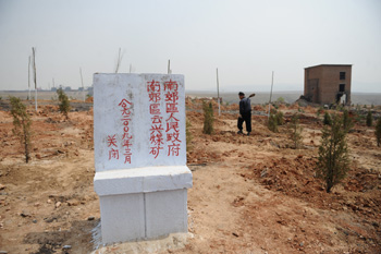 在山西省大同市南郊區(qū)一處被淘汰關(guān)停的小煤礦,一名工人正在護(hù)理新種的樹(shù)苗。記者 燕雁