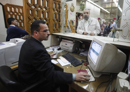 2月20日,埃及首都開(kāi)羅一家銀行的工作人員在柜臺(tái)前工作。埃及銀行業(yè)關(guān)閉一周后于20日重新開(kāi)門(mén)營(yíng)業(yè),這顯示出由于政局動(dòng)蕩而損失重大的埃及經(jīng)濟(jì)正開(kāi)始逐步恢復(fù)正常。近日,中東緊張局勢(shì)向巴林、也門(mén)和利比亞等國(guó)蔓延的趨勢(shì)已經(jīng)推動(dòng)國(guó)際油價(jià)和金價(jià)強(qiáng)勢(shì)上漲,白銀期價(jià)也上漲至31年來(lái)新高。