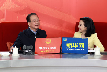 2月27日上午,中共中央政治局常委、國(guó)務(wù)院總理溫家寶接受中國(guó)政府網(wǎng)、新華網(wǎng)聯(lián)合專(zhuān)訪,與廣大網(wǎng)友在線交流。新華社記者
