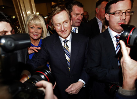 26日,愛爾蘭反對黨統(tǒng)一黨領(lǐng)袖恩達·肯尼(中)在都柏林出席支持者集會。恩達·肯尼說,他所領(lǐng)導的政黨已獲得議會眾議院選舉的勝利。他執(zhí)政后將盡快就愛爾蘭援助方案舉行談判,以調(diào)整部分條款,減輕愛爾蘭的負擔。 債務(wù)危機爆發(fā)后,愛爾蘭接受歐洲聯(lián)盟和國際貨幣基金組織850億歐元援助方案,被迫實施大幅度削減赤字措施。援助貸款年均利率為5.8%。這一方案引發(fā)公眾強烈不滿。