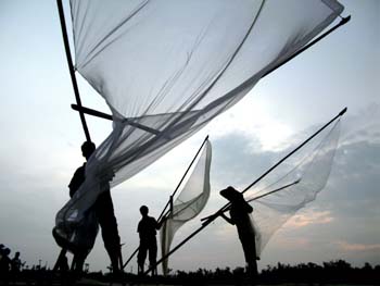 拉大網(wǎng)的時候,一般由被叫做“網(wǎng)頭”的人根據(jù)天氣、潮汐、風向和流水確定,大網(wǎng)也有大、中、小3種,其中大網(wǎng)長三四千米,中網(wǎng)長一二千米,小網(wǎng)則在千米以下,網(wǎng)寬均在4-6米之間。拉大風時,由參加拉網(wǎng)的人把網(wǎng)拉到竹排或者小艇上,先固定一頭,再由“網(wǎng)頭”一邊駕艇劃向海里,一邊呈半弧形撒下網(wǎng)繩和大網(wǎng),接著由岸上兩組人分別把住大網(wǎng)的兩頭,然后往岸上慢慢地一步一退地把大網(wǎng)收攏上來。網(wǎng)拉靠岸之時,就可把被圍困在大網(wǎng)內的魚、蝦、蟹、鱟等一一捕捉,通常一網(wǎng)能收獲200公斤左右的魚。在20世紀60年代,村民們曾經(jīng)一網(wǎng)就能打上2000多公斤的魚,其中曾經(jīng)創(chuàng)下一網(wǎng)拉上5000多公斤的紀錄。