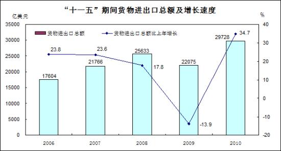 “十一五”前兩年,我國(guó)進(jìn)出口總額保持23%以上的快速增長(zhǎng),2007年出口總額突破1萬(wàn)億美元,進(jìn)出口總額邁上2萬(wàn)億美元臺(tái)階。2008年國(guó)際金融危機(jī)爆發(fā)后,在世界經(jīng)濟(jì)大幅下滑、國(guó)際市場(chǎng)需求嚴(yán)重萎縮的嚴(yán)峻形勢(shì)下,我國(guó)對(duì)外貿(mào)易經(jīng)受住了金融危機(jī)的嚴(yán)峻考驗(yàn)。2008年進(jìn)出口總額增長(zhǎng)17.8%,其中,進(jìn)口增長(zhǎng)18.5%,進(jìn)口總額首次突破1萬(wàn)億美元大關(guān)。2009年進(jìn)出口總額雖然下降13.9%,但我國(guó)依然是全球?qū)ν赓Q(mào)易表現(xiàn)最好的國(guó)家之一,降幅遠(yuǎn)低于全球貿(mào)易降幅。2009年我國(guó)出口總額躍居世界第一位,占全球出口比重由“十五”末的7.3%提高到9.6%;進(jìn)口總額上升至世界第二位。2010年我國(guó)進(jìn)出口再創(chuàng)歷史新高,進(jìn)出口總額接近3萬(wàn)億美元,達(dá)到29728億美元,增長(zhǎng)34.7%。其中,出口15779億美元,增長(zhǎng)31.3%;進(jìn)口13948億美元,增長(zhǎng)38.7%;進(jìn)出口均比“十五”末增長(zhǎng)1.1倍。