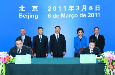 廣東省人民政府和澳門特別行政區(qū)政府6日在人民大會堂簽署了《粵澳合作框架協議》。雙方在協議中提出,將攜手建設亞太地區(qū)最具活力和國際競爭力的城市群,共同打造世界級新經濟區(qū)域,促進區(qū)域經濟一體化發(fā)展。
