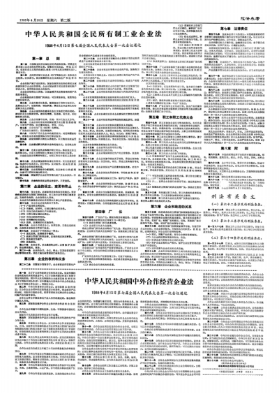 1988年4月16日《經(jīng)濟(jì)參考報(bào)》第二版全文刊登了在七屆全國(guó)人大一次會(huì)議上通過的《中華人民共和國(guó)全民所有制工業(yè)企業(yè)法》(下稱“企業(yè)法”)和《中華人民共和國(guó)中外合作經(jīng)營(yíng)企業(yè)法》。這兩部法律的頒布順應(yīng)了當(dāng)時(shí)的經(jīng)濟(jì)社會(huì)環(huán)境,其中企業(yè)法的頒布更是以法律形式確立了國(guó)企改革的階段性成果,在國(guó)企改革的初級(jí)階段起到了很大的推動(dòng)作用。