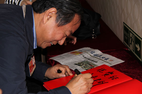 “寫得太好了!”周圍的記者都不禁贊嘆。于是,記者此前在兩會(huì)上從來沒有見到的一幕發(fā)生了,他們紛紛上前請(qǐng)求萬季飛為自己的報(bào)刊題詞。在萬季飛的身后,排起了一條捧著紙筆等待他題詞的記者組成的長隊(duì)。