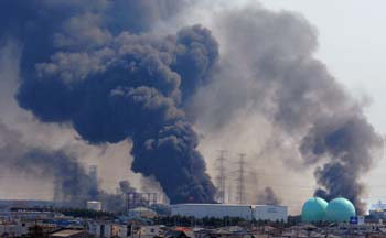 3月13日,滾滾濃煙從日本宮城縣多賀城的工業(yè)建筑物內冒出。新華社/法新 |