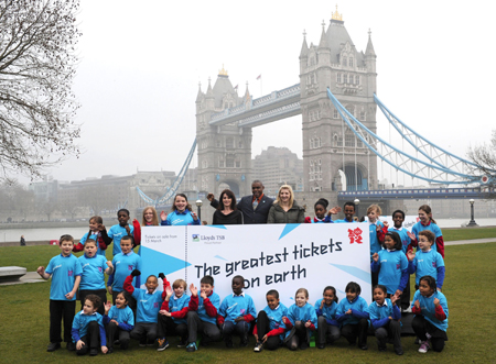 3月15日,在倫敦波特菲爾德公園內(nèi),前羅馬尼亞體操運動員科馬內(nèi)奇(后排左五)、美國田徑運動員卡爾?劉易斯(后排左六)和英國游泳運動員阿德林頓(后排左七)與代表倫敦奧運會26個比賽項目的小學(xué)生,簇?fù)碇粡埦扌烷T票合影。當(dāng)日,2012年倫敦奧運會門票正式開售。