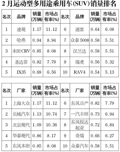 2月運(yùn)動(dòng)型多用途乘用車(SUV)銷售10.52萬輛,環(huán)比下降29.14%,同比增長49.54%。與上月相比,2月銷量排名前10位的SUV品牌中,哈弗、眾泰5008、漢蘭達(dá)排名保持不變;排名上升的有:途觀上升兩位,逍客上升三位,圣達(dá)菲上升六位;排名下降的有:IX35下降一位,本田CRV下降兩位,瑞虎、RAV4下降四位。