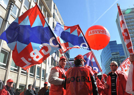 3月24日,在比利時首都布魯塞爾,示威者高舉旗幟參加反對歐盟緊縮政策的游行。 當天,歐盟舉行春季首腦會議,將通過整治歐洲主權(quán)債務(wù)危機的全面應(yīng)對方案。由于方案中一些緊縮政策涉及普通民眾的利益,因此招致工會的反對。大約2萬多名歐盟各國的工人24日走上布魯塞爾街頭舉行示威游行。
