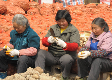 魔芋是一種富含優(yōu)質(zhì)膳食纖維的植物,具有防止肥胖、三高、糖尿病等功能,是天然的保健食品和醫(yī)藥原料,市場(chǎng)前景看好。圖為貴陽(yáng)市修文縣久長(zhǎng)鎮(zhèn)蘆山村村民在給魔芋種“切芽”!