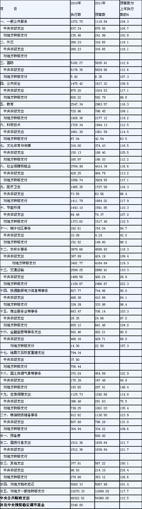 由于2011年政府支出科目發(fā)生變化,為了便于比較,2010年執(zhí)行數(shù)按2011年科目口徑做了調(diào)整,具體調(diào)整內(nèi)容詳見“2011年中央財政公共預(yù)算編表說明”。