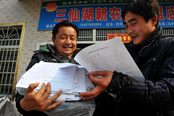 湖南益陽南縣三仙湖鎮(zhèn)新聯(lián)村種糧大戶彭志才(左)與別人合伙,將全村1950畝土地全部流轉(zhuǎn)到了自己手上。拿著今年上百份土地流轉(zhuǎn)合同,彭志才很是高興,但他同時(shí)也為日益增加的成本而犯愁。記者