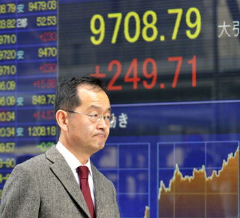 3月30日,在日本東京,行人經(jīng)過電子股價(jià)顯示屏。受日元匯率走低及前一個(gè)交易日紐約股市上漲等因素影響,30日東京股市日經(jīng)225種股票平均價(jià)格指數(shù)上漲2.64%,為11日大地震以來最高收盤值。