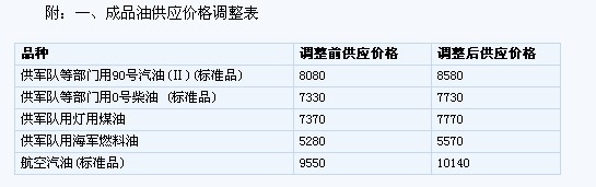 (一)成品油生產經營企業(yè)供軍隊及新疆生產建設兵團、國家儲備用汽、柴油(標準品,下同)供應價格每噸分別提高500元和400元,調整后的汽、柴油供應價格分別為每噸8580元和7730元。其他成品油價格相應調整。調整后的成品油標準品價格見附表一。非標準品價格由成品油生產經營企業(yè)按照國家規(guī)定的品質比率確定。 (二)供交通、民航等專項用戶汽、柴油最高供應價格等額提高。調整后的汽、柴油標準品最高供應價格每噸分別為8980元和8130元。非標準品最高供應價格由成品油生產經營企業(yè)按照國家規(guī)定的品質比率確定。其中,供鐵道、漁業(yè)、林業(yè)、農墾用汽、柴油價格暫按供軍隊用油價格執(zhí)行。 對符合資質的民營批發(fā)企業(yè)最高供應價格,按最高零售價格扣減400元確定。當市場零售價格降低時,對民營批發(fā)企業(yè)的供應價格也要相應降低,保持價差不小于400元。 具體供應價格可在不超過最高供應價格的前提下,由供需雙方協(xié)商確定。 (三)各地汽、柴油最高零售價格等額提高。調整后各省(區(qū)、市)和中心城市汽、柴油最高零售價格水平見附表二。各省(區(qū)、市)價格主管部門按規(guī)定的品質比率調整汽、柴油非標準品最高零售價格。 成品油零售企業(yè)可在不超過最高零售價格的前提下,自主制定具體零售價格。 (四)汽、柴油最高批發(fā)價格等額提高。合同約定由供方配送到零售企業(yè)的,最高批發(fā)價格按最高零售價格倒扣300元確定;合同未約定配送的,最高批發(fā)價格由各省(區(qū)、市)價格主管部門在300元的基礎上,再考慮運雜費因素確定。當市場零售價格降低時,批發(fā)價格也要相應降低,保持批零價差不小于300元。各省(區(qū)、市)價格主管部門按規(guī)定的品質比率制定非標準品最高批發(fā)價格。 成品油批發(fā)企業(yè)可在不超過最高批發(fā)價格的前提下,與零售企業(yè)協(xié)商確定具體批發(fā)價格。 (五)液化氣最高出廠價格按照與供軍隊等部門用90號汽油供應價格保持0.92:1的比價關系確定,供需雙方可在不超過最高出廠價格的前提下協(xié)商確定具體價格。 (六)調整后的價格自2011年4月7日零時起執(zhí)行。