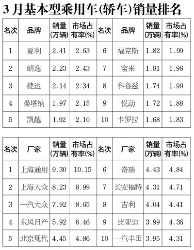 3月,銷量排名前十位的轎車生產(chǎn)企業(yè)共銷售56.54萬(wàn)輛,占轎車銷售總量的62%。與上月比較,上海通用、上海大眾、一汽大眾繼續(xù)保持前三甲不變,排名上升的有:奇瑞上升三位,東風(fēng)日產(chǎn)上升一位;排名下降的有:吉利下降兩位,北京現(xiàn)代、比亞迪下降一位;一汽豐田新進(jìn)前十,神龍跌出前十。
