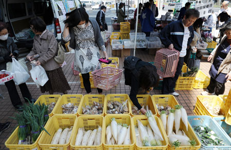 4月17日,在日本首都東京,顧客在街頭選購福島縣矢祭町農(nóng)民售賣的農(nóng)產(chǎn)品。 受福島核電站事故影響,福島縣出產(chǎn)的農(nóng)產(chǎn)品近期銷路不佳。新華社發(fā)