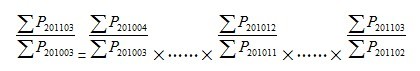 2、同比價(jià)格指數(shù)的計(jì)算方法。鑒于網(wǎng)簽數(shù)據(jù)從2010年12月份起開始上報(bào),前11個(gè)月的網(wǎng)簽數(shù)據(jù)缺失,故不能計(jì)算今年1-11月份各月與網(wǎng)簽數(shù)據(jù)同一口徑的同比價(jià)格指數(shù)。為保持同比價(jià)格指數(shù)計(jì)算和發(fā)布的連續(xù)性和穩(wěn)定性,滿足有關(guān)方面的需要,國(guó)家統(tǒng)計(jì)局采用2010年的有關(guān)房?jī)r(jià)統(tǒng)計(jì)數(shù)據(jù)和2011年按網(wǎng)簽數(shù)據(jù)計(jì)算的房?jī)r(jià)數(shù)據(jù),根據(jù)同比指數(shù)和環(huán)比指數(shù)之間的數(shù)學(xué)關(guān)系,對(duì)3月份同比價(jià)格指數(shù)的計(jì)算進(jìn)行了技術(shù)處理:將2010年4-12月份(9個(gè)月)的環(huán)比數(shù)據(jù)連乘,再乘以2011年前3個(gè)月的環(huán)比數(shù)據(jù)生成本月同比價(jià)格指數(shù)。以此類推可計(jì)算其他月份的同比價(jià)格指數(shù)。計(jì)算公式表示為:
