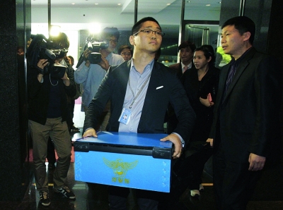 圖為:3日,在韓國首都首爾的谷歌公司辦公室,一名警察搬運在此沒收的物品。新華社/路透
