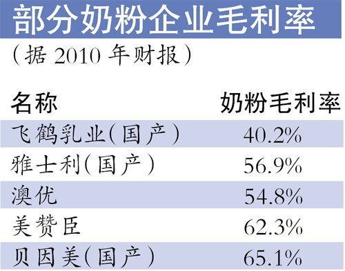 據(jù)調(diào)研公司Euromonitor的統(tǒng)計(jì),上述6大“洋奶粉”在國(guó)內(nèi)奶粉市場(chǎng)份額約為40.1%!把竽谭邸钡拿适欠裼痔貏e高呢?本報(bào)翻查上市公司年報(bào)發(fā)現(xiàn),嬰幼兒奶粉尤其是高端奶粉毛利率普遍較高,國(guó)產(chǎn)品牌如貝因美毛利率更站上65.1%,甚至高過(guò)一些“洋奶粉”。