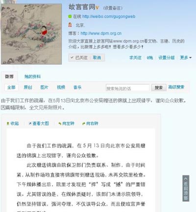 故宮博物院16日通過微博就其向北京市公安局贈(zèng)送錦旗出現(xiàn)錯(cuò)字一事,向公眾道歉。故宮在這份聲明中說,此次贈(zèng)送錦旗由保衛(wèi)部門負(fù)責(zé)聯(lián)系、制作,贈(zèng)送前未“交院里檢查”。在媒體質(zhì)疑時(shí),該部門未請(qǐng)示院領(lǐng)導(dǎo),仍然堅(jiān)持錯(cuò)誤,強(qiáng)詞奪理,不僅誤導(dǎo)公眾,而且使故宮聲譽(yù)受到嚴(yán)重影響。 故宮博物院日前向北京市公安局贈(zèng)送錦旗,感謝警方迅速破獲展品被盜案。而一面寫有“撼祖國強(qiáng)盛,衛(wèi)京都泰安”的錦旗,引起網(wǎng)友質(zhì)疑,稱“撼”為錯(cuò)別字,正確用字應(yīng)為“捍”。面對(duì)質(zhì)疑,接受媒體采訪的故宮相關(guān)負(fù)責(zé)人解釋說:“‘撼’字沒錯(cuò),顯得厚重。跟‘撼山易,撼解放軍難’中‘撼’字使用是一樣的。”此舉引發(fā)外界更大的質(zhì)疑,有語言文字方面的專家表示,“撼”字在這里肯定是錯(cuò)別字。 16日,故宮博物院通過微博對(duì)外發(fā)布聲明,就此事向公眾道歉。 故宮方面的聲明全文如下。 由于我們工作的疏漏,在5月13日向北京市公安局贈(zèng)送的錦旗上出現(xiàn)錯(cuò)別字,謹(jǐn)向公眾致歉。 此次贈(zèng)送錦旗由院保衛(wèi)部門負(fù)責(zé)聯(lián)系、制作,由于時(shí)間緊,從制作場地直接將錦旗帶到贈(zèng)送現(xiàn)場,未再交院里檢查。下午媒體播出后,院里才發(fā)現(xiàn)把“捍”寫成“撼”的嚴(yán)重錯(cuò)誤。尤其錯(cuò)誤的是,在媒體質(zhì)疑時(shí),該部門未請(qǐng)示院領(lǐng)導(dǎo),仍然堅(jiān)持錯(cuò)誤,強(qiáng)詞奪理,不僅誤導(dǎo)公眾,而且使故宮聲譽(yù)受到嚴(yán)重影響。 事情發(fā)生后,院里即時(shí)進(jìn)行認(rèn)真調(diào)查,給予當(dāng)事人嚴(yán)肅的批評(píng)教育,并采取了補(bǔ)救措施。故宮博物院現(xiàn)正組織全院各部門舉一反三,吸取教訓(xùn),堵塞漏洞,增強(qiáng)工作責(zé)任心,進(jìn)行全面整改。