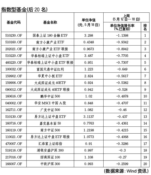 國泰基金管理有限公司旗下的,2011年3月底設(shè)立的的國泰上證180金融ETF以-1.14%的凈值增長率成為本周(5月12日-18日)指數(shù)型基金收益倒數(shù)第一,其今年以來年漲幅為-5.02%。