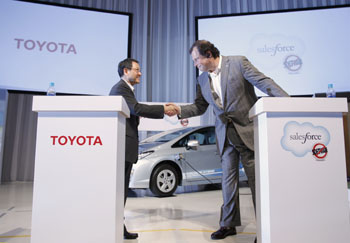 5月23日,日本豐田汽車公司總裁豐田章男(左)和美國Salesforce.com網(wǎng)站首席執(zhí)行官馬克·貝尼奧夫在東京共同出席新聞發(fā)布會(huì)。 當(dāng)日,日本豐田汽車公司和美國Salesforce.com網(wǎng)站在東京召開新聞發(fā)布會(huì),宣布將建立一個(gè)面向豐田消費(fèi)者的私人社交網(wǎng)站“豐田之友”,該網(wǎng)站將與即將上市的豐田電動(dòng)車及插入式混合動(dòng)力車同時(shí)發(fā)布。