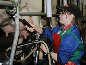 芬蘭南部一奶牛場(chǎng)的奶農(nóng)嚴(yán)格按照瓦利奧公司《牛奶質(zhì)量手冊(cè)》規(guī)定的牛奶生產(chǎn)守則為奶牛消毒和擠奶。記者 趙長春