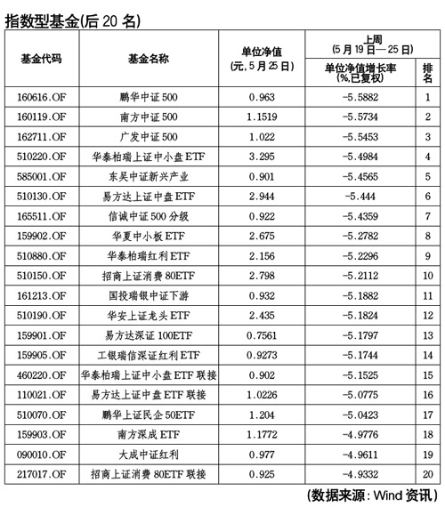 鵬華基金管理有限公司旗下的,2010年2月成立的鵬華中證500以-5.59%的凈值增長率成為本周(5月19日-25日)指數(shù)型基金收益倒數(shù)第一,其今年以來年漲幅為-7.29%。