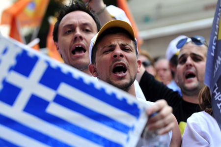 5月30日,在希臘雅典,希臘郵政銀行的雇員在憲法廣場議會大樓前集會,反對政府為應(yīng)對債務(wù)危機而采取的緊縮措施。 日前,希臘政府提出新的財政緊縮措施,并計劃加快500億歐元的私有化進程,以力爭實現(xiàn)2011年的減赤目標,從而順利獲得歐盟和IMF的援助貸款。但這些計劃遭到反對黨強烈抵制。帕潘德里歐警告說,如果不能盡快拿到貸款,希臘極可能走向破產(chǎn)。