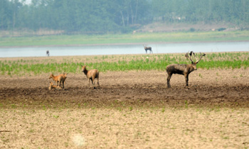 湖北石首麋鹿國家級自然保護(hù)區(qū)位于長江新舊河道的夾角處,總面積2.3萬畝。目前,生活在這里的近400頭麋鹿正遭受著前所未有的干旱危機(jī)。正處發(fā)情交配期的麋鹿,沒有適合發(fā)情交配的沼澤環(huán)境,可能推遲交配,甚至不交配。干旱還會導(dǎo)致保護(hù)區(qū)內(nèi)的濕地旱化,給麋鹿的草料、食物及生存帶來困難。為保證麋鹿飲水,保護(hù)區(qū)已修建30多個水槽,定期加水供麋鹿飲用。圖為幾只麋鹿在石首麋鹿國家級自然保護(hù)區(qū)內(nèi)覓食。記者