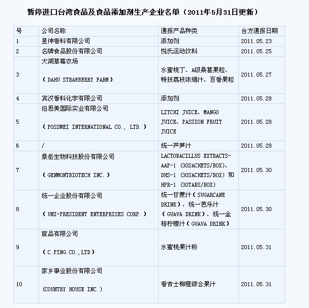 一、自2011年6月1日起,暫停進(jìn)口臺(tái)灣方面通報(bào)的問(wèn)題產(chǎn)品生產(chǎn)企業(yè)生產(chǎn)的運(yùn)動(dòng)飲料、果汁、茶飲料、果醬果漿、膠錠粉類產(chǎn)品和食品添加劑。